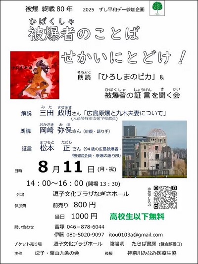 8/10(日) 10:00~15:00 - 丸木夫妻の「原爆の図」原寸大複製画や親江会資料の展示、広島・長崎の被爆者のお話し、映画「黒い雨」などの上映を行います。