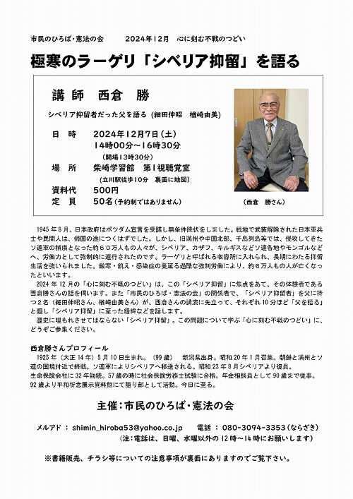 講師:関原正裕(日朝協会会長)著書「関東大震災朝鮮人虐殺の真相』『治安維持法100年』ほか