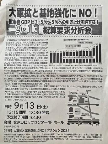 - トランプ政権は、在日米軍駐留経費(思いやり予算)の増額も求めてくると思われます。また、関税交渉とも絡んで米国製兵器の爆買いだけでなく、日米共同の兵器開発などを通した軍需産業の育成にも今まで以上に多額の予算が注ぎ込まれると予想されます。8月末に防衛省が出す「概算要求」を批判的に分析し、2026年度”増税大軍拡予算”の編成を許さない取り組みを展望していきたいと思っています。是非、ご参加ください。