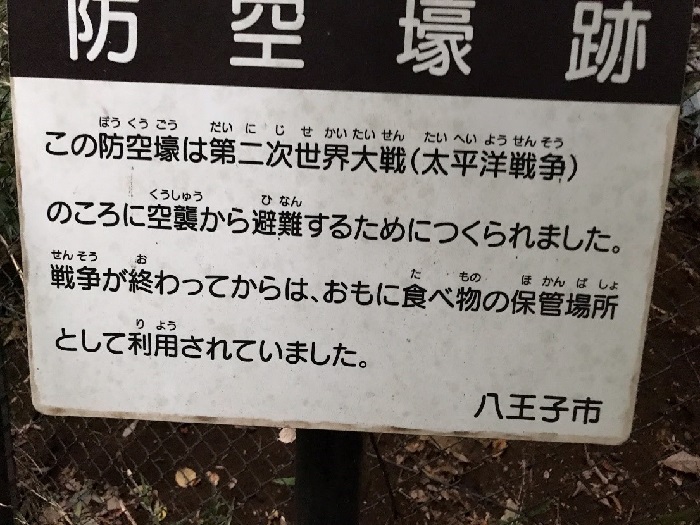 公園の南側、標高の低い方の入口近くに横穴があります。1944年頃に作られたと思われる、自家用防空壕の跡です。